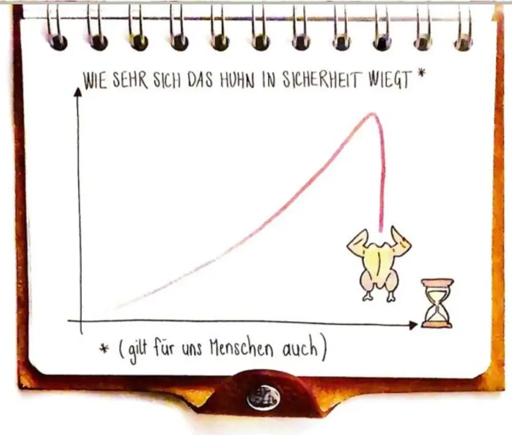 Tatsächlich aber sind auch wir nichts anderes als dumme Hühner. Wir lernen aus der Vergangenheit, glauben, Muster zu erkennen, und schliessen daraus auf die Zukunft. Je mehr Daten wir haben, desto grösser ist unsere Gewissheit. (Eigentlich: Je besser es uns geht, desto grösser unser Glaube, dass es so weitergeht). Und künstliche Intelligenz ist auch kein Ausweg aus dem Induktionsproblem, sondern dessen technologische Perfektion. Auch die KI weiss nichts über die Zukunft. Sie kennt nur Wahrscheinlichkeiten aus Vergangenem. Sie ist, wenn man so will, ein extrem schlaues Huhn. Was aber auch sie nicht erkennt, sind jene Brüche, die die Spielregeln verändern: unerwartete Ereignisse, gesellschaftliche Kipppunkte, plötzliche Schlachtungen.